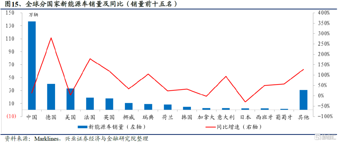 分国家来看,欧洲各国新能源车销量增速最高,中国次之,美国增速较低,欧洲多国新能源车渗透率已达双位数。2020年,德国、法国、英国、瑞典、意大利为销量增速最快的五个国家,分别实现新能源车销量40.5、19.1、18.0、9.0、2.9万辆,分别同比增长278.8%、177.8%、118.7%、103.9%和94.0%。挪威、瑞典、荷兰新能源车渗透率已分别达到58.3%、27.2%和23.5%。德国、葡萄牙、英国、法国渗透率分别为12.6%、11.7%、9.3%和9.1%。