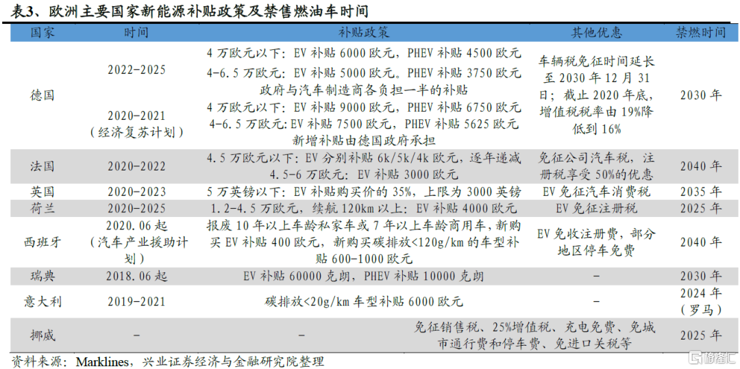 主要欧洲国家规划于2040年前禁售燃油车并制定中期过渡目标:荷兰、挪威将在2025年率先禁售燃油车,德国、瑞典、爱尔兰、瑞士为2030年,英国禁售燃油车的时间为2035年,法国、西班牙计划2040年禁售燃油车。此外,各国还制定了中期销量目标以完成向燃油车禁售的平稳过渡:法国计划2022年新能源车销量较2017年提升5倍;英国计划在2030年完成新能源新车50%的渗透率;德国计划在2022年拥有100万辆电动车保有量。
