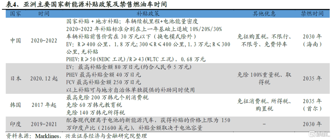 日本:补贴提升,电动化进程加速,2035年禁售燃油车。2021年1月,在日本第204届例行国会上,日本首相菅义伟表示,到2035年日本销售新车100%将为电动化车辆。此外,日本经济产业省宣布将纯电动汽车最高补贴金额由40万日元提升至80万日元(约合人民币5万元),插电式混合动力车最高补贴金额由20万日元增至40万日元,燃料电池车最高补贴金额由225万日元增至250万日元。2021年2月起日本各中央政府部门及其所属机构将仅采购电动化车辆。在此背景下,我们预计日本新能源车销量将迎来快速增长。