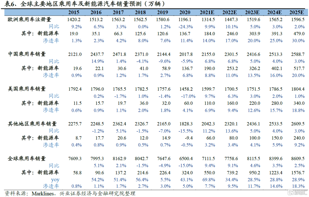 预计全球新能源车销量到2025年有望达到1576.7万辆,2021-2025年复合增速有望达到37.2%。我们预计全球乘用车销量2021年有望同比增长9.4%,其中中国同比增长6.8%,美国同比增长9.7%,欧洲同比增长9.9%,其他地区同比增长11.2%。与此同时,我们预计到2025年全球新能源车销量有望达到1576.7万辆,年复合增速为37.2%。其中欧洲2025年新能源车销量有望达到479.0万辆,乘用车渗透率达到30%,中国新能源车销量有望达到517.7万辆,乘用车渗透率20%;美国新能源车销量有望达到340.0万辆,乘用车渗透率为18.8%;其他地区新能源车销量有望达到240万辆,渗透率为18.3%。