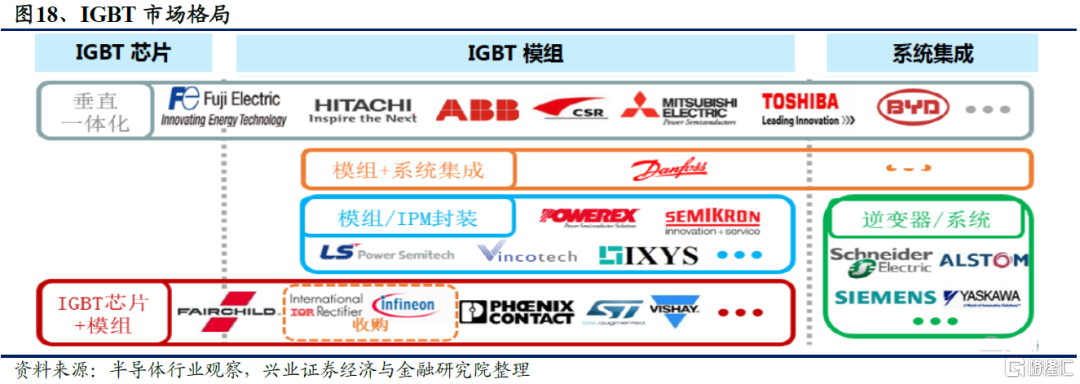 2019年全球IGBT市场规模49.1亿美元,中国市场规模约162亿人民币,但是几乎被外资垄断:中国中高端MOSFET及IGBT主流器件市场上,90%主要依赖进口,基本被国外欧美、日本企业垄断。中国车规级IGBT市场中,英飞凌在中国市场占据绝对主导地位,市场占有率达到58%;比亚迪半导体为18%,主要配套自有车辆;其他重要IDM国产厂商为斯达股份与中车时代电气,华虹半导体主要为IGBT代工,赛晶电力电子为IGBT外企分销商,同时在推进IGBT封装生产。