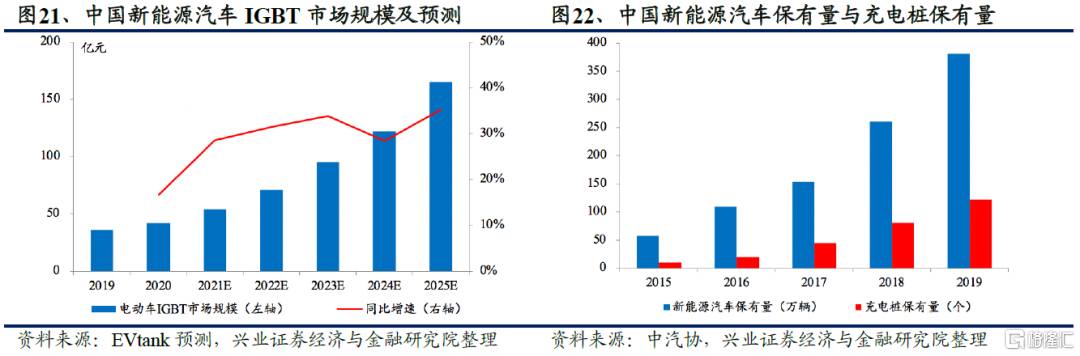 IGBT芯片国产化需求迫切,新能源汽车IGBT国产化替代空间宽广。IGBT芯片为电动汽车的电机驱动控制模块的重要部件,2019年中国新能源汽车IGBT市场规模为36亿元,伴随2025年国家政策要求新能源汽车销售占比达到25%,将会极大刺激对IGBT的需求,预计未来五年年均增速保持30%,2025年中国新能源汽车电驱IGBT市场规模可达165亿元。充电桩方面,成本为10万元的快充桩IGBT价值量约为2万元,快充桩占充电桩总数的20%。国家政策要求2025年车桩比达2.7,由此带来的IGBT需求广阔,国产化替代空间巨大。