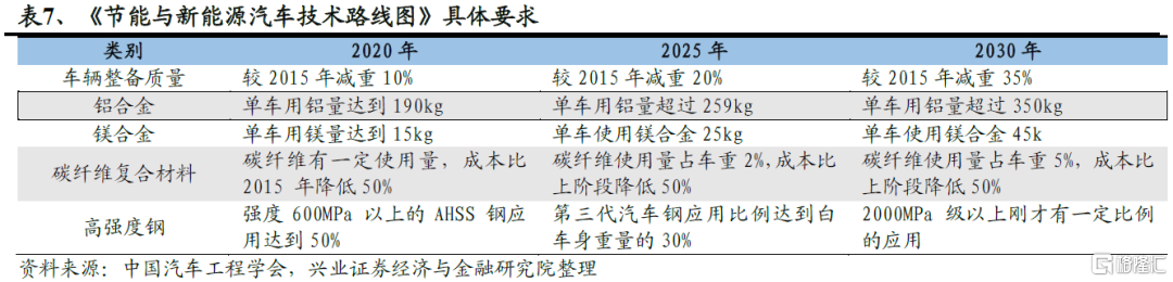 我国单车用铝量逐年提升,未来仍有巨大空间。根据中国汽车工程学会发布的《节能与新能源汽车技术路线图》,2021年至2025年,我国将实现整车质量比2015年减重20%,单车用铝量达到350kg。第三阶段为2026年至2030年,实现整车质量比2015年减重35%,单车用铝合金达到350kg。