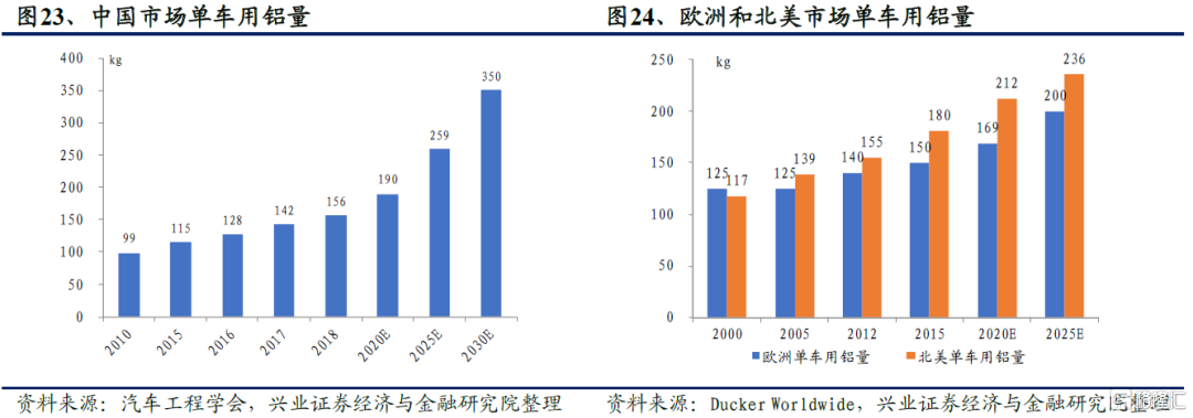 欧洲和北美市场单车用铝量正在并仍将提高。根据欧洲铝业协会与Ducker Worldwide的统计得知,欧洲市场中自1990年到2018年,单车铝合金的使用量从50kg增长到180kg,到2025年单车铝合金使用量将达到200kg;北美轻型车辆车铝材用量从2015年的180kg增长到2020年212kg,并将在2025年达到236kg。