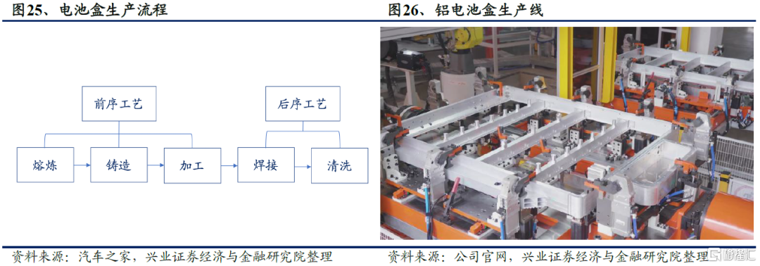 电池盒是汽车电动化过程中的纯增量零部件。电动汽车的动力系统从传统的“发动机+变速箱”转变成了“电池+电机+电控”,因此电池盒是传统汽车不具备的纯增量部件,铝合金以其优秀的性价比成为新能源汽车电池盒的首选材料。铝电池盒生产壁垒高,先行布局的零部件厂商有望掌握先发优势。铝电池盒是安全件,生产工艺要求严苛,硬件投入强度大,对材料强度、热稳定性和清洁度要求高。