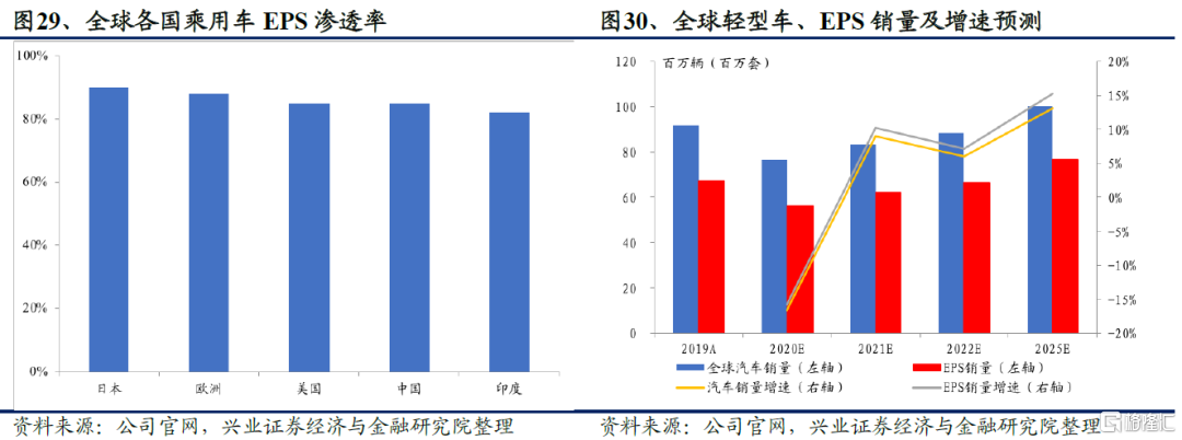 新兴市场乘用车EPS渗透率仍有提升空间,短期需求有望迎来恢复性增长:欧美市场作为成熟汽车市场,乘用车EPS渗透率在85%~90%。中国市场2019年EPS出货量约为1800万套,乘用车EPS渗透率已超过80%。相比欧美等成熟市场,中国、印度、巴西等新兴市场EPS渗透率仍有5%~10%的提升空间。2020年全球轻型汽车销量同比减少15%。由于全球主要汽车市场的复苏,预计2021年全球新轻型车销量为8340万辆,较2020年增长9%。此外,基于2022年有效疫苗有望在全球广泛接种的假设,预计2022年全球汽车销量将进一步恢复,同比增速约为6%。伴随全球汽车销量恢复以及EPS渗透率小幅提升,我们预计2021-2022年全球电动助力转向系统出货量有望同比分别增长10%、7%。