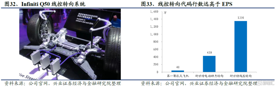 汽车智能驾驶级别的不断提高对转向系统系统可靠性的要求也越来越高。L1/L2 ADAS故障率的容忍度分别为700/100 FIT,L3-L5 ADAS容忍度最高为10 FIT,采用硬件和软件宂余是降低系统故障率最直接的方式。目前大多数EPS产品可以实现L1-L2 ADAS功能达到部分自动化驾驶,一些高可用性EPS产品可以实现高级别ADAS功能,达到高水平自动化驾驶。线控转向(SbW)系统是转向系统目前最先进的发展方向。线控转向取消了方向盘与转向轮之间的传统机械连接,减少了系统反应时间,在安全性、轻量化和组装灵活性上均有更好的表现。由于没有方向盘和车轮之间的机械连接,线控转向需要高可靠性的硬件和软件宂余,这需要靠大量的算法和代码来实现。线控转向曾于2015年在 Infiniti Q50首次实现量产,该系统采用3个ECU和2个电机硬件宂余,保持机械连接以防系统故障。