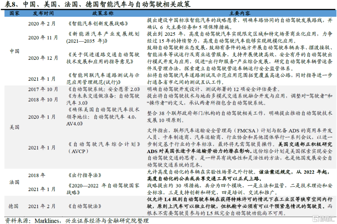 总体而言,无人驾驶商用车的落地取决于技术的成熟以及政策法规的完善。政策方面,各国纷纷推出自动驾驶技术发展战略及规划。目前来看,美国自动驾驶商业化法规配套最为完善。此外,科技公司的技术成熟也是自动驾驶商业化落地的关键,目前自动驾驶技术成熟度仍然有待提升。