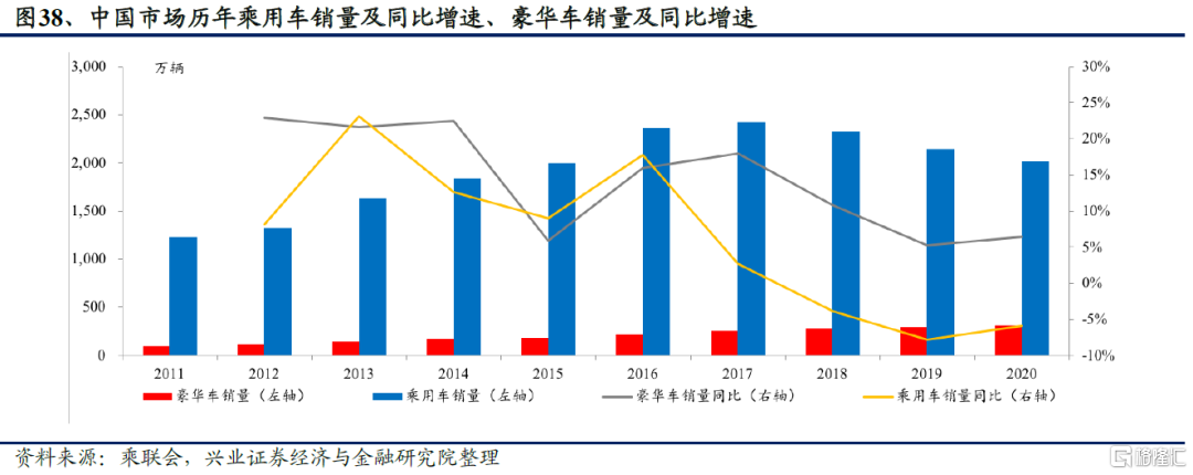 中长期豪华车渗透率有望达到20%,未来十年销量复合增速有望达到6%。我们认为,未来随着低线城市居民消费进一步升级以及豪华车价格的继续下探,中国市场中长期豪华车渗透率有望达到20%。假设豪华车渗透率在2030年达到20%,乘用车市场销量恢复到2017年水平(约2500万辆),则豪华车销量有望在2030年达到500万辆,对应2020-2030年复合增速约为6%。