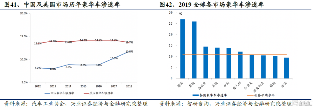 与发达国家相比,我国豪华车渗透率仍有增长空间。中国市场近年来豪华车渗透率迅速提升,2019年中国市场豪华车渗透率约为13.8%。参考先行国家,我们发现美国豪华车市场渗透率长年保持在14%左右,而德国、英国等国家渗透率均在25%以上。而我国北京、上海、浙江、江苏等地豪华车渗透率已超过20%。我们认为,我国与发达国家相比,豪华车渗透率仍有增长空间;分地区来看,低线城市豪华车市场增长潜力巨大。