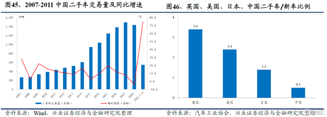 中国是全球最大的新乘用车市场,二手车市场增长空间巨大。2020年,中国新乘用车销量为2018万辆,汽车保有量约为2.81亿辆,二手车交易量为1434万辆;美国新车销量为1458万辆。汽车保有量约为2.87亿辆,二手车交易量约为4000万辆。2020年中国二手乘用车交易量占新乘用车销量的百分比仅为71%,显著低于成熟汽车市场,英国约为344%、美国约为239%、日本约为137%。未来,伴随中国汽车保有量近一步增加、二手车交易制度健全、政策不断完善及落地以及二汽车不对称信息问题的解决,未来二手车市场增长空间巨大。