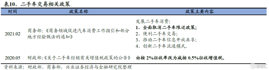增值税减按0.5%增收,限迁政策全面取消,两大政策促进二手车供给端与需求端同步增长:2020年4月,财政部发布关于二手车经销有关增值税政策的公吿,公吿称自2020年5月1日至2023年12月31日,从事二手车经销的纳税人销售其收购的二手车,由原按照简易办法依3%征收率减按2%征收增值税,改为减按0.5%征收增值税。2021年2月,商务部在《商务领域促进汽车消费工作指引和部分地方经验做法的通知》中,就扩大新车消费、发展二手车消费、促进汽车更新消费、培育汽车后市场等方面给出具体建议,提出要全面取消二手车限迁政策。我们认为,增值税减按0.5%增收政策有利于促进二手车经销商进入市场,二手车交易市场竞争与优质供给有望增强,限迁政策全面取消有望促进二手车需求释放。