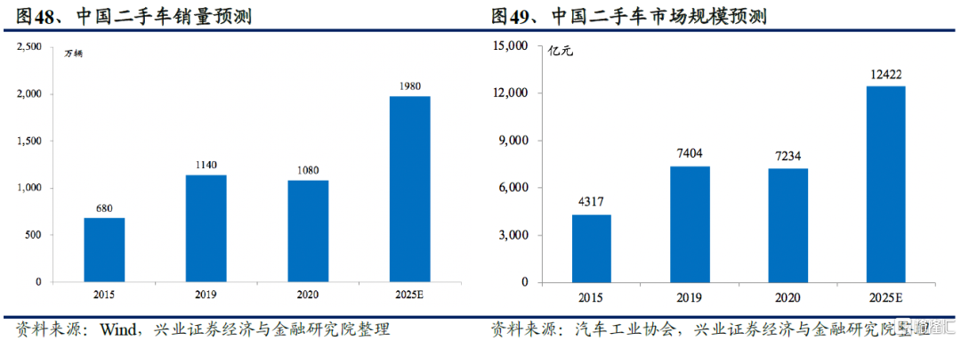 二手车交易量有望迎来快速增长,市场规模巨大,豪华车经销商优势明显。伴随汽车之家、瓜子、易车等线上平台、汽车经销商等传统销售网络进入二手车市场,二手车交易信息透明度及车型供给有望得到改善,消费者信心有望提升,二手车市场有望迎来蓬勃发展。2020年二手乘用车交易量约占二手车交易量的75%,根据艾瑞咨询预测,国内二手乘用车市场销量将由2020年的1080万辆增加至2025年的1980万辆,CAGR12.6%。中国二手乘用车市场规模预计将由2020年的7234亿元增加至2025年的12422亿元,CAGR11.4%。我们认为,豪华车经销商在二手车车源(保值率更高的豪华车型)、售后维修与保养(4S网络与维修技术成熟)、客户流量(消费者主动进店购车)、资金(二手车库存周转较慢,二手车经销商库存资金压力更大)等方面具备明显优势,更有望享受二手车市场快速增长的红利。
