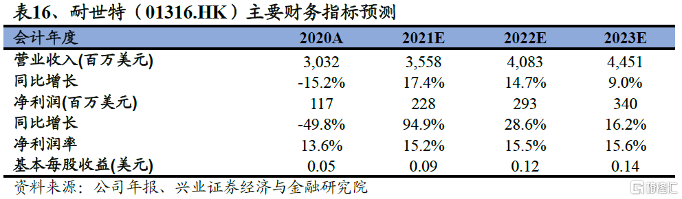 我们的观点:公司专注汽车转向系统逾百年,拥有极强的研发与创新能力、深厚的经验与技术积累,核心产品符合汽车行业大趋势,自动驾驶技术储备充足、行业领先,有望持续享受汽车行业转型变革红利。伴随全球汽车行业迎来恢复性增长,公司核心客户表现回暖、新客户项目持续投产,公司的高负载EPS优势受益汽车电动化、高端化逻辑正在逐步兑现,我们认为耐世特已经走出业绩低谷,重回增长通道。考虑到全球汽车市场恢复性增长以及耐世特未来在电动智能领域的成长性,我们预计公司2021-2023年利润分别为2.28亿美元、2.93亿美元和3.40亿美元。目标价维持16.22港元,相当于23倍2021年PE,维持“买入”评级。