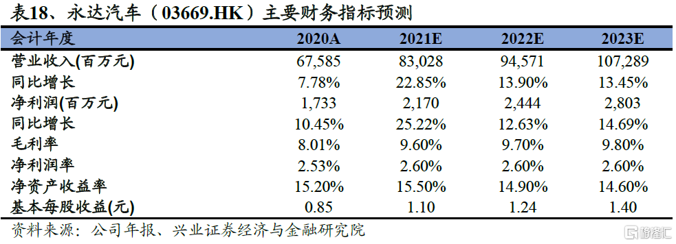 我们的观点:短期汽车行业受到芯片短缺影响,豪华品牌厂商在芯片获取方面拥有更强的话语权,受到影响相对较小。此外,供给偏紧有利于带来新车销售折扣的持续回收,经销商盈利能力有望提升。永达汽车是宝马和保时捷最大经销商,公司大力发展二手车和新能源业务,整体经营效率持续改善,后续剥离汽车金融业务有望改善公司资产负债结构。长期来看我国豪华车渗透率还有提升空间,后市场规模也有望增长。我们预计公司2021-2023年收入分别为830.28亿元、945.71亿元、1072.89亿元,利润分别21.70亿元、24.44亿元、28.03亿元,给予目标价17.07港元,相当于13倍2021年PE,维持“审慎增持”评级。