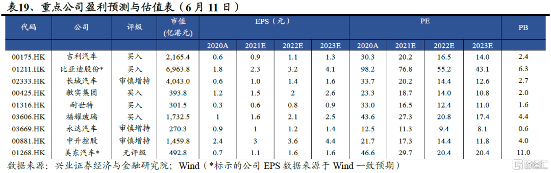 我们的观点:短期芯片短缺拐点将至,2021-2022行业销量提升确定性强,有望带来行业性投资机会,建议关注中国市场回暖+海外市场恢复为整车以及零部件企业带来业绩的边际改善。未来几年豪华车市场还将继续保持可观的增长空间,二手车市场迎来交易沃土,兼营豪华品牌及二手车的经销商有望从中受益。此外,新能源汽车将重塑行业价值链,相关优质供应链标的将明确受益向上周期带来的业绩弹性。伴随汽车智能网联化渗透率的不断提升,汽车产业相关零部件技术将迭代升级带动单车配套价值提升、确定性强的增量零部件将为相关零部件企业带来巨大增长潜力。(1)整车:建议重点关注比亚迪股份(01211.HK)、吉利汽车(00175.HK)、长城汽车(02333.HK),推荐关注蔚来(NIO.N)、理想汽车(LI.O)、小鹏汽车(XPEV.N)。(2)零部件:建议重点关注敏实集团(0425.HK)、福耀玻璃(03606.HK)、耐世特(01316.HK),推荐关注中车时代电气(03898.HK)。(3)经销商:建议重点关注中升控股(00881.HK)、永达汽车(03669.HK),推荐关注美东汽车(01268.HK)。(4)商用车自动驾驶:推荐关注图森未来(TSP.O)。