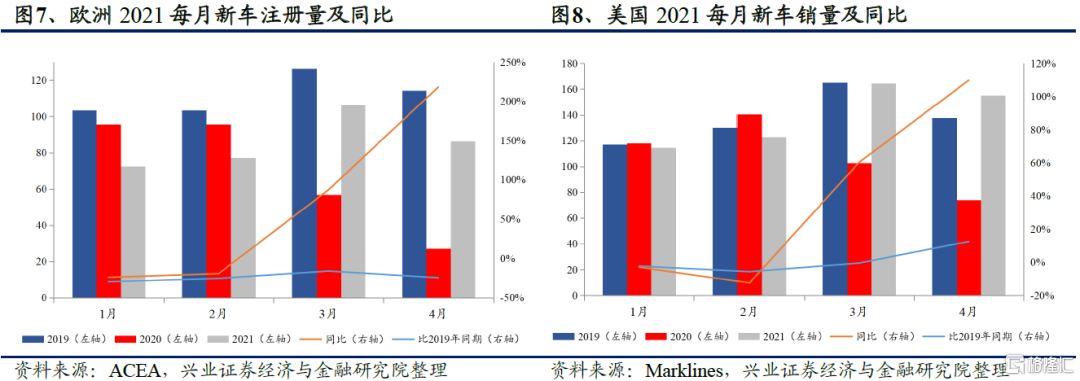 欧美汽车需求仍在快速恢复。3月和4月,美国新车销量达到164.5/155.1万辆,实现同比增长60.3%/109.8%;1-4月,美国新车销量达到557.1万辆,同比增长11.1%,与2019年同期相比增长1.2%。3月和4月,欧洲新车注册量分别达到106.2/86.2万辆,同比增长87.3%/218.6%;1-4月, 欧洲累计新车注册量为342.3万辆,同比增长24.4%,与2019年同期相比下降23.5%。由于基数低,同比有大幅增长趋势,但仍未恢复到2019年水平。