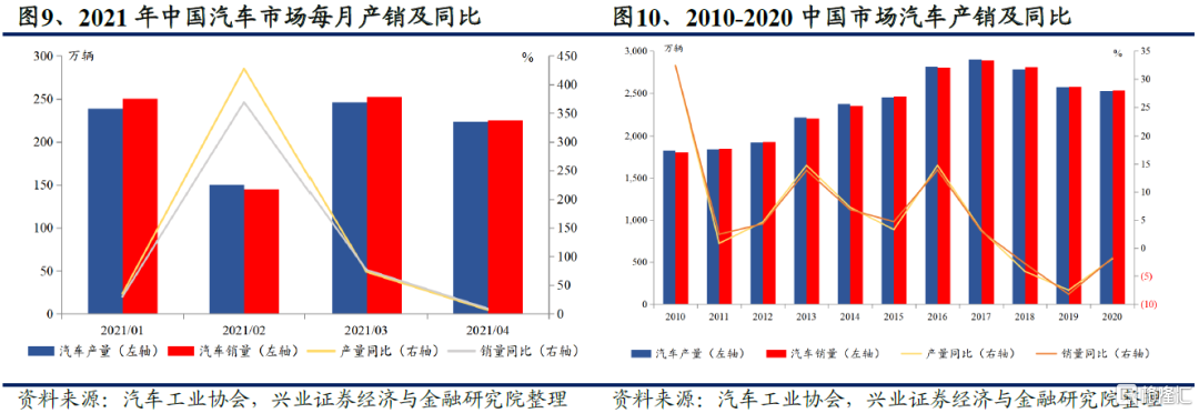 中国汽车行业持续回暖复苏,汽车产销已连续13个月实现同比增长。由于2020年同期基数较低,2021年1-4月的汽车产销都实现了同比增长,其中2月的产量同比增长428.09%,销量同比增长369.38%。特别是疫情防控形势好转,使得需求端持续恢,但供给端略受“缺芯”影响。2021年1-4月,汽车累计产销同比2020年分别增长53.4%和51.9%,同比2019年分别增长1.7%和4.7%。
