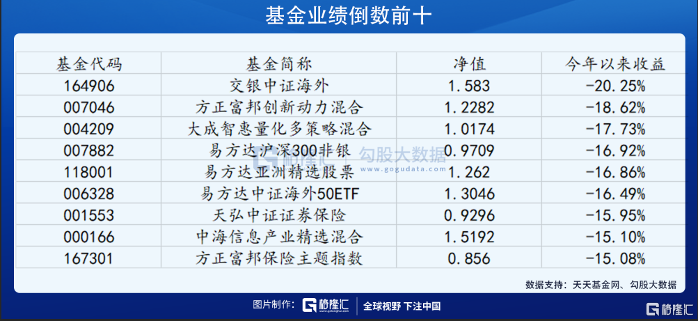 根据天天基金网显示,全市场8216只基金当中,收益倒数前十的基金在今年跌幅均超15%,这其中易方达的基金三只基金、方正基金有两只,而在今年受到政策影响,海外类型的基金也是达到了三只。
