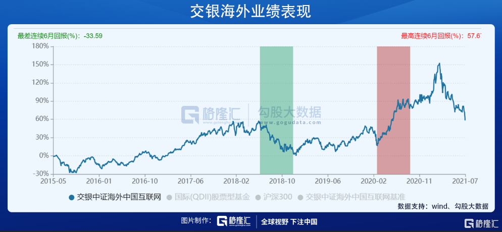而全市场排名倒数第一的基金是:交银中证海外,是国内首只跟踪海外中概股的指数基金,今年收益率跌幅20.25%,从2015-05-27成立以来,取得58.30%的收益,小于同类平均水平,同类排名27/57,从该基金表现来看,区间最大收益最高超150%,而到现在回到60%左右,近乎下跌了一大半。