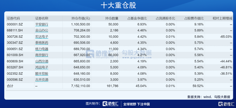 前三大重仓股分别是:平安银行、金山办公和宏达电子,不过泰格医药、格力电器、南京银行、山西汾酒、鸿远电子、顺丰控股持仓占比均在4%以上。但是在今年,重仓股当中,跌幅最高的分别是顺丰控股、格力电器和古井贡酒。