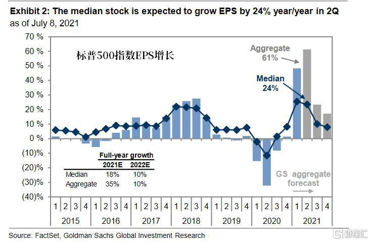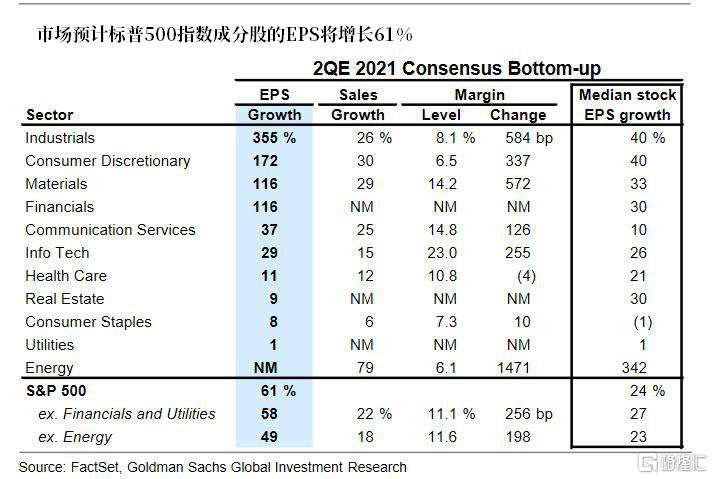 市场普遍预计第二季度上市企业每股收益(EPS)将同比增长61%,这是由于基数效应、销售高增长和净利率扩张共同推动的。
