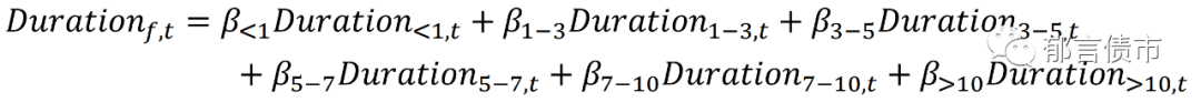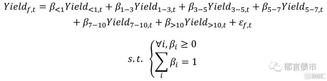 其中〖Yield〗_(f,t)为第f只中长期纯债基金在第t天的涨跌幅,而〖Yield〗_(i,t)为i待偿期分段子指数在第t天的涨跌幅。i待偿期分段子指数涨跌幅的回归系数β_i就衡量i待偿期区间债券的持仓占比。
