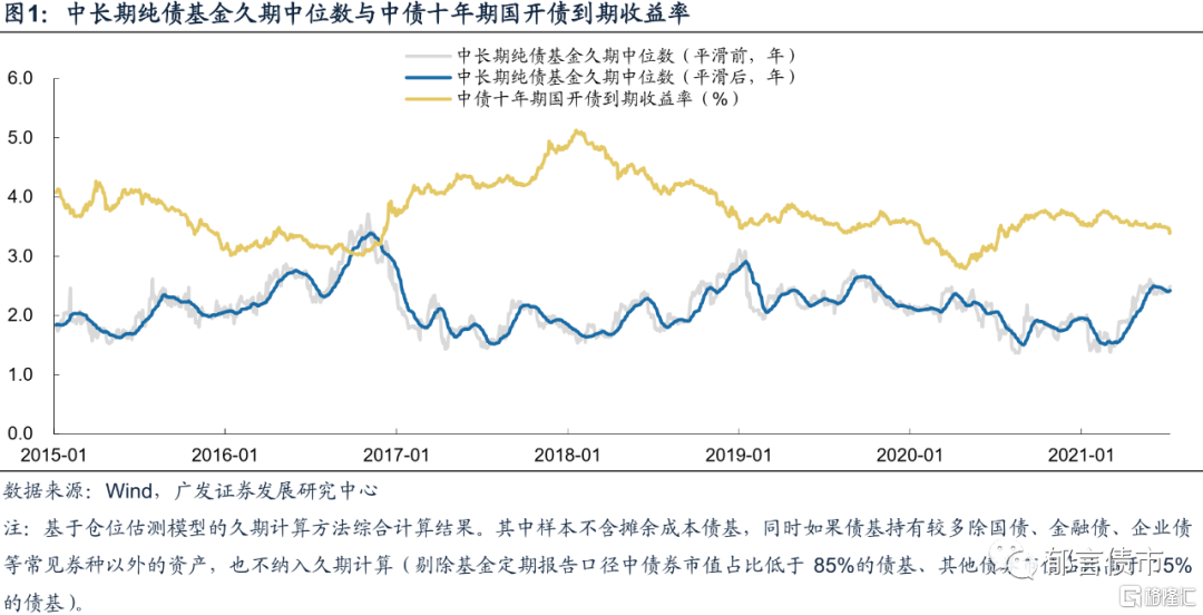 对于得到的每只中长期纯债基金的久期时间序列数据,同时可以计算中长期纯债基金久期市场中枢水平,即中长期纯债基金久期的中位数。由于数据的波动幅度较大,需要进行平滑化处理。考虑到数据的实时性,窗口期不宜设置过长,我们选择以20天为窗口期计算移动平均值。