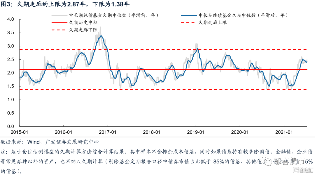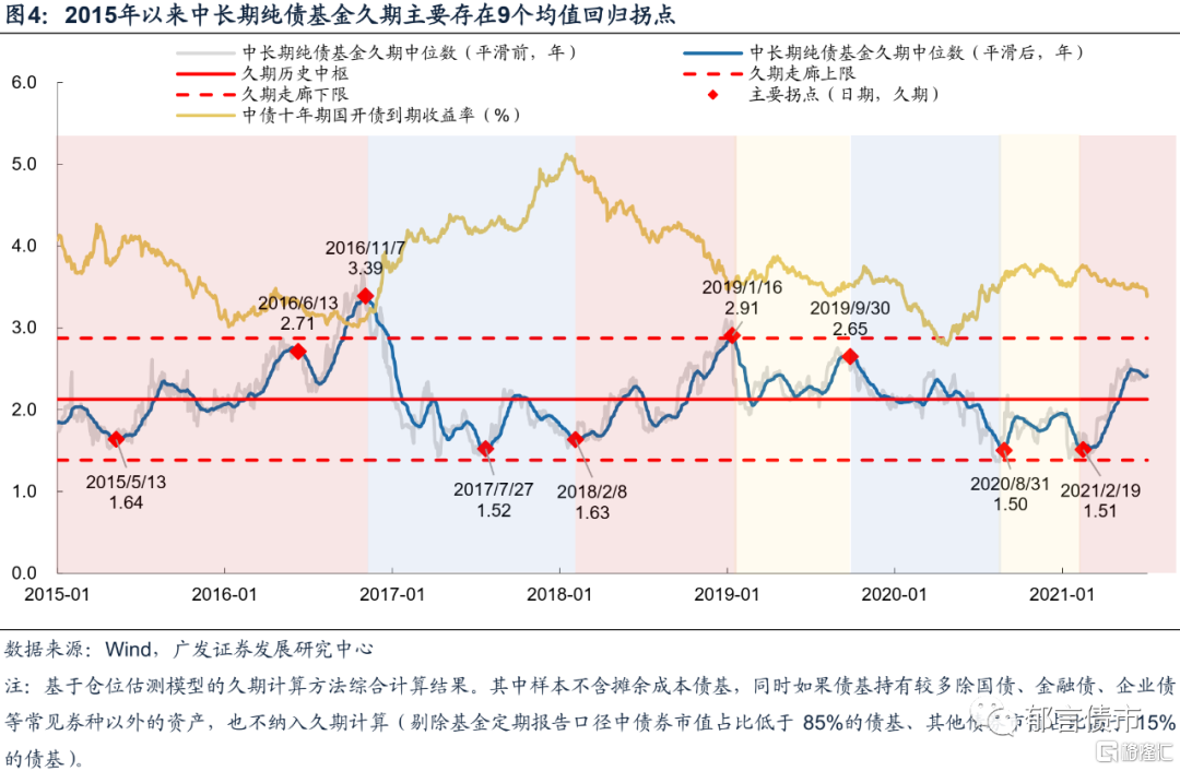 2015年以来,中长期纯债基金久期主要存在9个偏离均值的拐点。其中接近久期走廊上限的拐点为2016年6月、2016年11月、2019年1月、2019年9月,而接近久期走廊下限的拐点为2015年5月、2017年7月、2018年年2月、2020年8月、2021年2月。