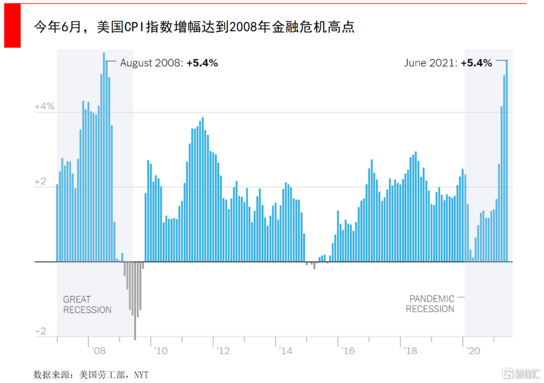 美国劳工部在7月14日表示,6月消费者价格指数(即CPI)较上年同期上升5.4%。这个数字挺恐怖,是2008年金融危机以来的最高升幅。