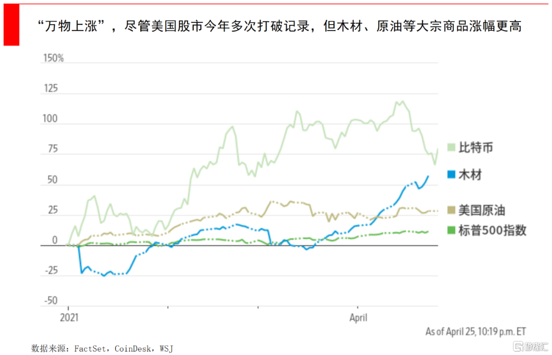 价格是一步一步传导的。随着大宗商品的上涨,美国房价也达到了房地产泡沫破裂前2006年的水平,股市也在不断上涨,标普500和道琼斯都在不断破纪录,几乎可以说是“万物上涨”。