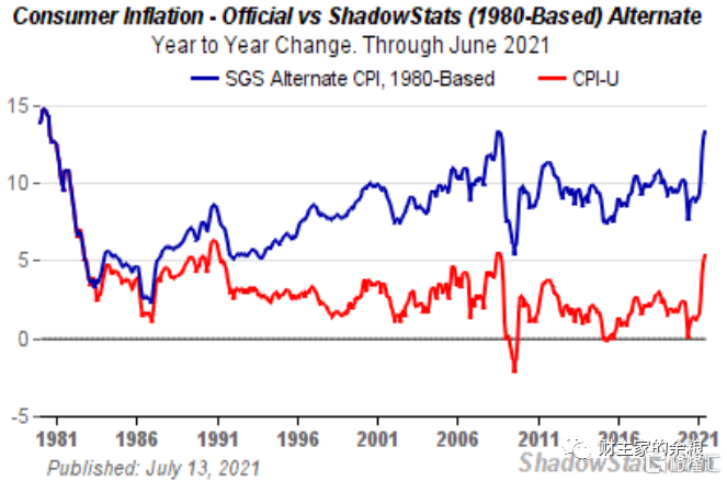 说明:图中红线为美国官方通胀率数据,而蓝线则为影子统计网站(SGS)根据美国1980年未修正的CPI统计方法得到的美国真实通胀率数据。