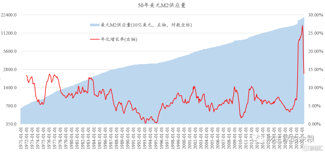 如果观察美元M2发行情况,我们会发现,其实从2019年10月份起,美元M2的增速已经开始提升,到了2020年3月份,随着美联储的疯狂印钞,美国的M2增速开始急速提升,这种高速增长一直持续到现在。