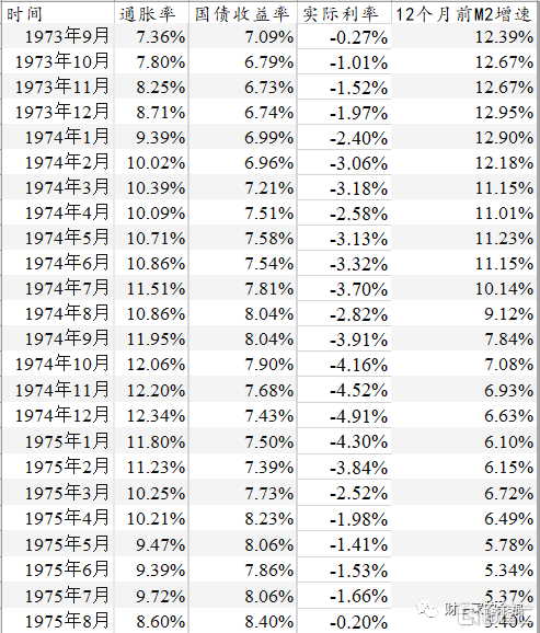 货币的高增速,再叠加上中东战争引发的欧佩克石油禁运,由此导致美国的通胀率飙升,而在美国政府的压力之下,美联储上阵购买国债,压低国债收益率,由此导致美国出现了长达2年的深度实际负利率。