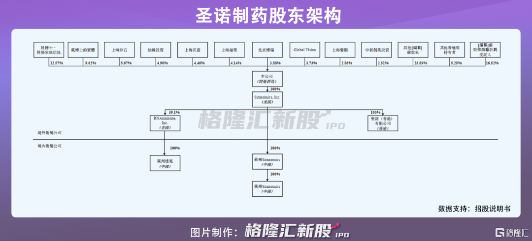 在IPO前的股东架构中,陆博士及其家族信托持股12.57%,为其第一大股东;戴晓畅博士持有公司9.62%股份;旋石基金旗下的上海冲石、仙瞳投资以及沃森生物旗下的上海沃嘉分别持股占比5.67%、4.90%、4.46%。