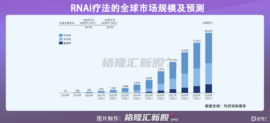 近几年来RNA疗法热度不断上升,尤其2020年疫情爆发后,RNAi疗法备受市场关注。全球市场规模由2018年的12百万美元增加至2020年的362百万美元,年复合增长率为449.2%,预计2030年将达到208.72亿美元。