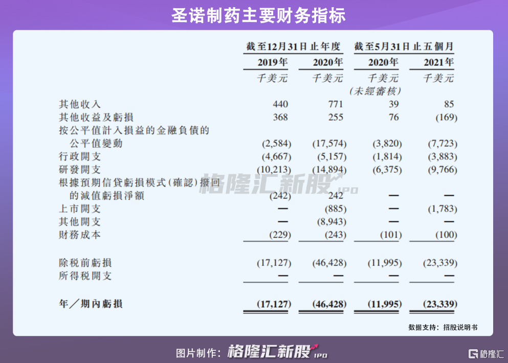 由于尚未有产品商业化上市,圣诺制药仍处于持续烧钱状态。2019年-2020年,公司其他收入分别为44万美元、77.1万美元;同期亏损分别达1712.7万美元、4642.8万美元。今年前五个月,圣诺制药亏损幅度进一步加大,收入8.5万美元,亏损达到2333.9万美元。