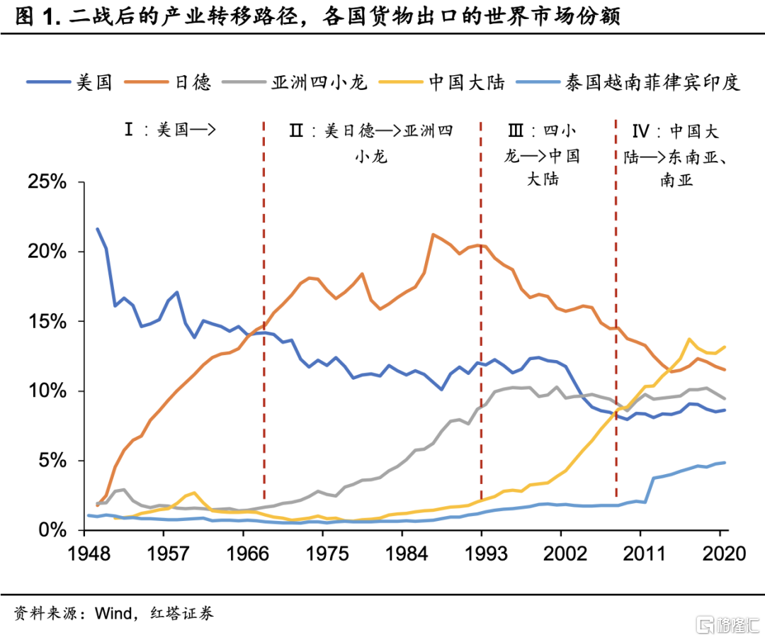 通过梳理,我们总结出二战后总共出现了四次国际产业转移,从美国到日本德国(50-60年代),从日德到亚洲四小龙(70-80年代)再到中国内地(90年代-08金融危机前)。现在我们正处于第四次产业转移的浪潮中,一些中低端制造业由中国内地向东南亚国家转移,而高端制造则有向老牌工业化国家回流的趋势。