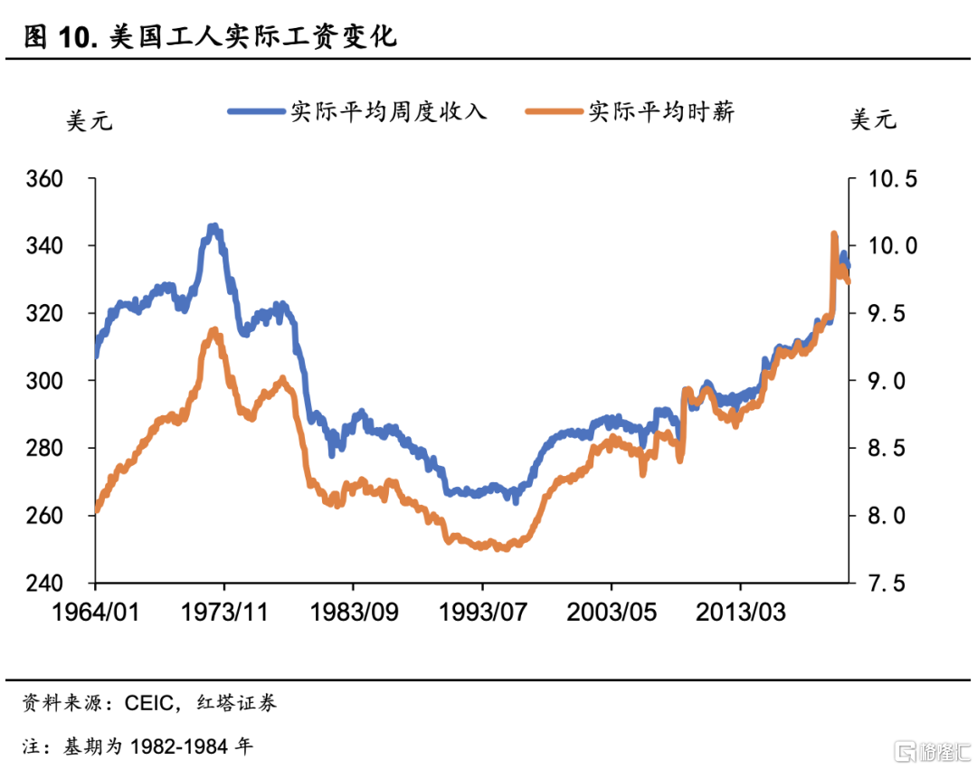 在这个期间,工人的工资待遇得到了空前的提升,美国生产工人实际的平均周度收入(剔除物价因素)从1964年初的307美元提升至1973年的344美元,涨幅达到12%。