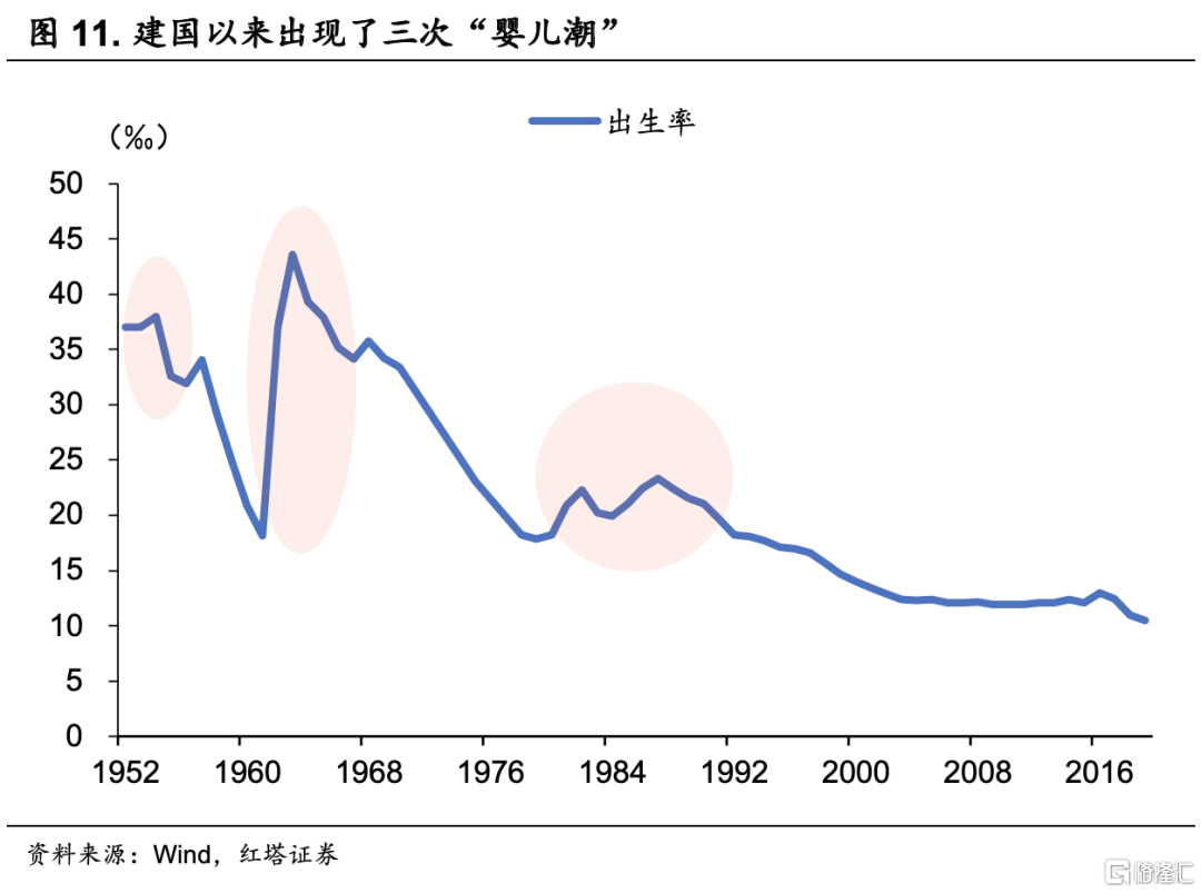 在全球产业转移的过程中,我国承接的产业主要集中在劳动密集型产业和传统资本密集型产业,存在巨大的劳动力需求。新中国成立之后,我国迎来了三次“婴儿潮”,分别是上世纪50年代刚解放时期,1962年三年自然灾害结束之后,以及80-90年代的回声婴儿潮时期。在中国承接海外转移的这一阶段,人口结构呈现年轻化,为国内制造业发展注入了大量生力军。