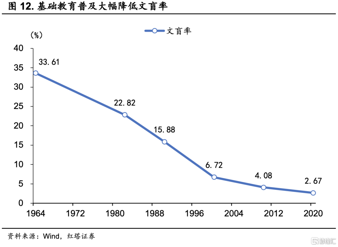 在新中国成立之初,文盲率曾高达80%,劳动者文化水平不高,极大地制约了现代化工业的发展。1950年,第一次全国工农教育会议中首次提出“推行识字教育,逐步减少文盲”之后,兴起了遍布全国的扫盲运动,大幅提高了基础教育的普及度,到了2000年中国文盲率已经降低至6.72%。