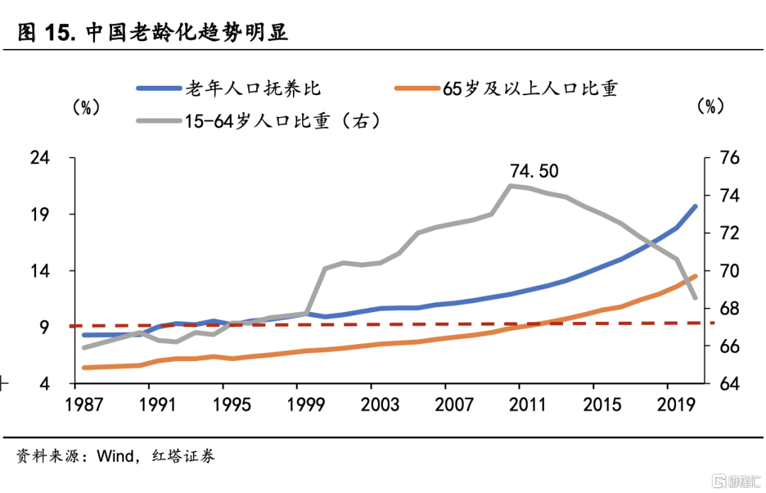 如果按照联合国的标准,中国在步入21世纪时也就是2000年开始便步入了老龄化社会(65岁以上老年人口比重达到7%)。年轻人口比重自2011年达到74.5%的峰值后逐年下降,根据第七次人口普查结果显示,2020年我国65岁及以上老龄人口达到13.5%,老年人抚养比达19.69%,这也意味着过去依靠较低的抚养比带来的人口数量红利渐入尾声。