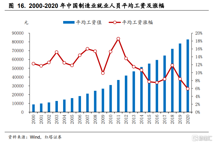 与之对应的,劳动力的成本也在提高。自2000年以来,我国制造业就业人员平均工资逐年上升,已经由2000年的8750元提升至了2020年82783元,20年间翻了9倍有余。低廉劳动力成本在国际分工中的竞争优势逐步削弱, 低端的廉价出口模式难以为继。