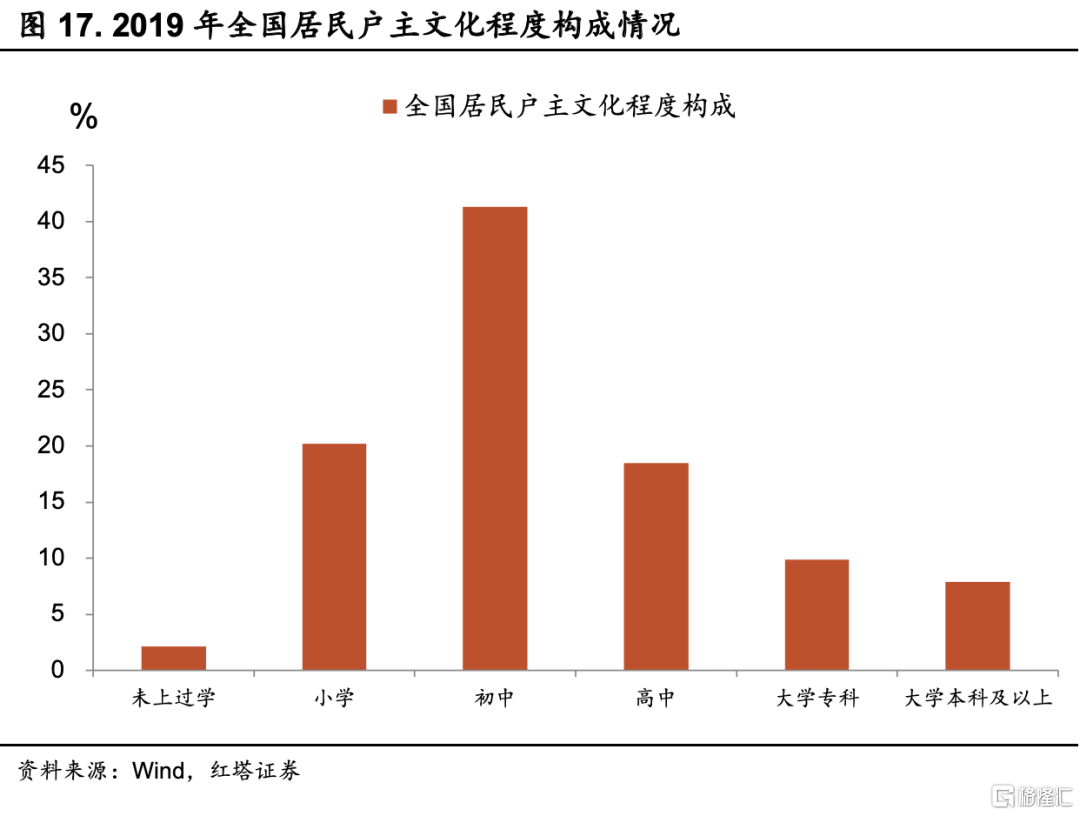 同时我们统计了世界银行公布的劳动力中具有基础教育水平的劳动年龄人口比重,以美国和英国这两个老牌的发达国家为例,2019年这一数据分别是42.19%、60.49%,与中国同处亚洲的韩国是47.77%。