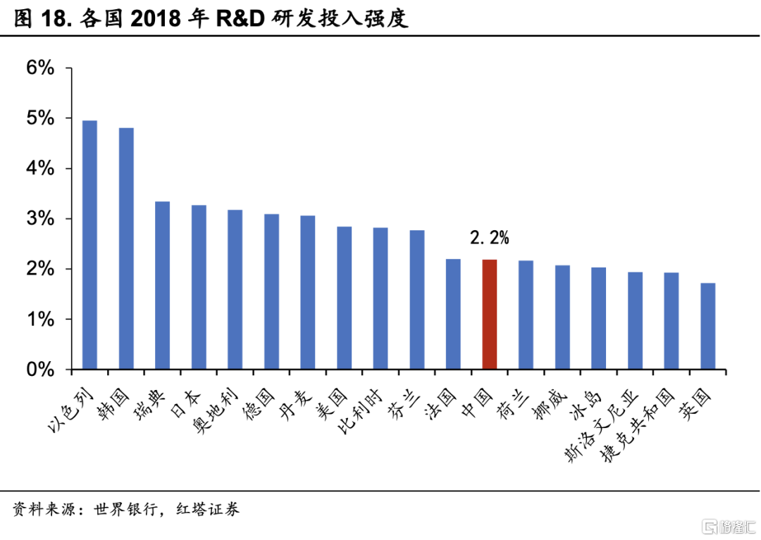 具体从科技投入经费来看,根据世界银行的数据显示,2018年全国R&D投入强度(R&D占GDP的比重)为2.2%。其实这个比重相较其他发展中国家,甚至部分发达国家来说都已经算高了,但对比老牌工业化国家,尤其是经历过产业转移的美、日、德、韩来说,还有很大的差距。