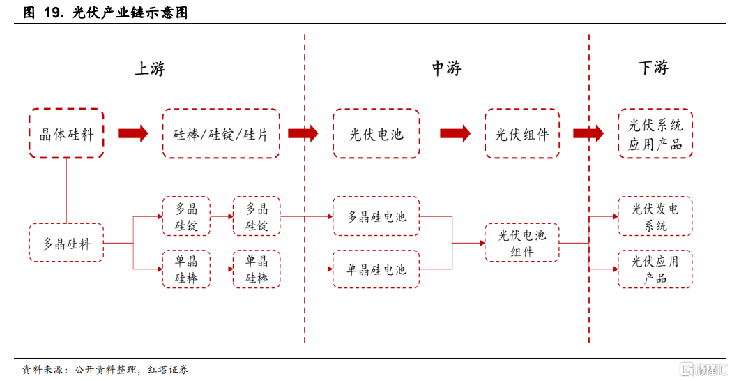 前文我们提到,从一开始我国就是通过参与中低端生产制造来加入全球化分工的。具体到光伏产业链来看,它的上游是硅料和硅片等原材料制造,中游是光伏电池和组件的制成,下游则是各类发电站。