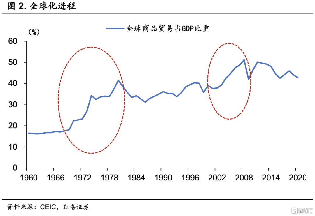 虽然全球化趋势在二战战后,伴随美国向日德的产业转移就已经开始了,但如果我们用商品贸易占GDP的比重来衡量经济全球化的进程,可以发现,直到70年代全球化进程才出现了质的变化。从1969年开始,在短短11年的时间里,全球商品贸易占GDP比重从18%迅速提升至42%,也就是说在1980年的时候,全球各国产生的GDP近一半都是通过国际间的贸易活动取得的。