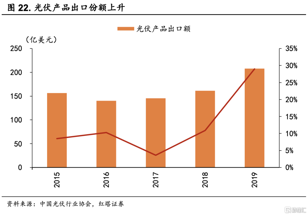再加上2018年 “双反”结束,中国的光伏企业又一次走入了国际舞台。与最初不同的是,此时中国的光伏产业链不再受制于人。在技术与成本优势的双重加成之下,中国光伏制造凭借着极高的性价比,也就是好用、便宜、响应快的优势,再次获得了国际市场的青睐。2019年全国光伏产品出口额再次突破200亿美元,在2020全球光伏企业20强中,中国企业占据16家,且囊括前五名。