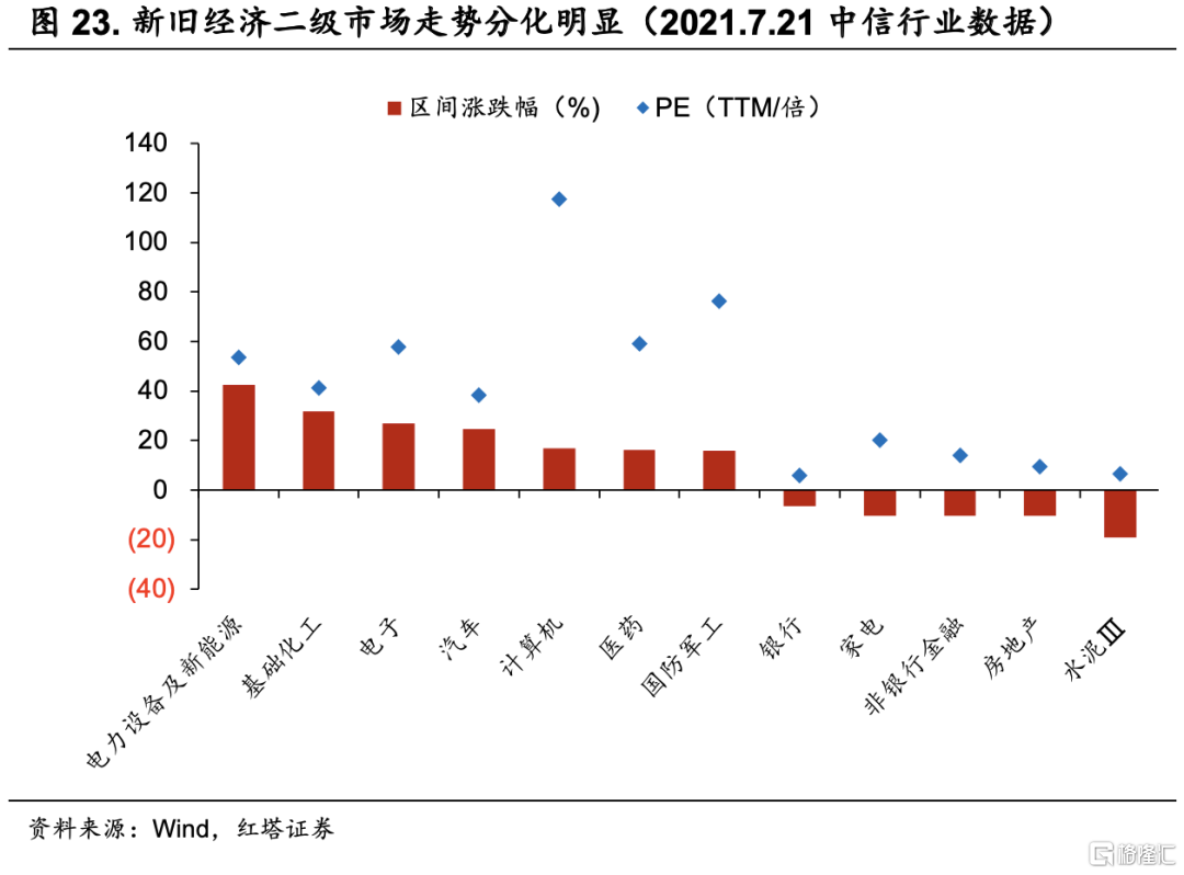 我们先来看一下近期的市场走势。自二季度以来,新能源、半导体等新兴产业表现持续火热,无论是涨幅还是估值都处于领先水平。而传统经济的代表,比如像房地产行业及其衍生产业链,包括银行、家电、水泥等板块表现偏弱,新旧经济分化明显。