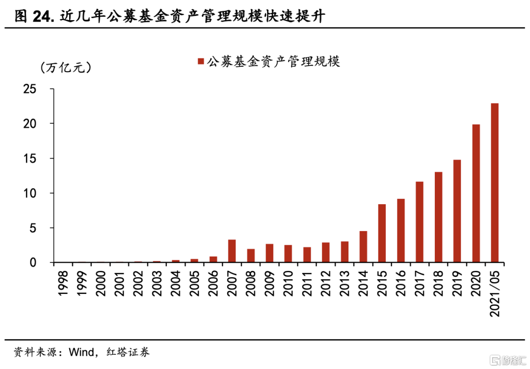 而这些新兴行业的估值之所以水涨船高,主要受益于当前机构的一致性预期。公募基金资产管理规模在近两年快速扩大,截至2021年5月公募AUM为22.9万亿,相比2019年底增长了55%。随着机构投资者规模不断扩大,其在市场中的话语权不断加强,公募投资偏好也会影响资本市场的投资风格。